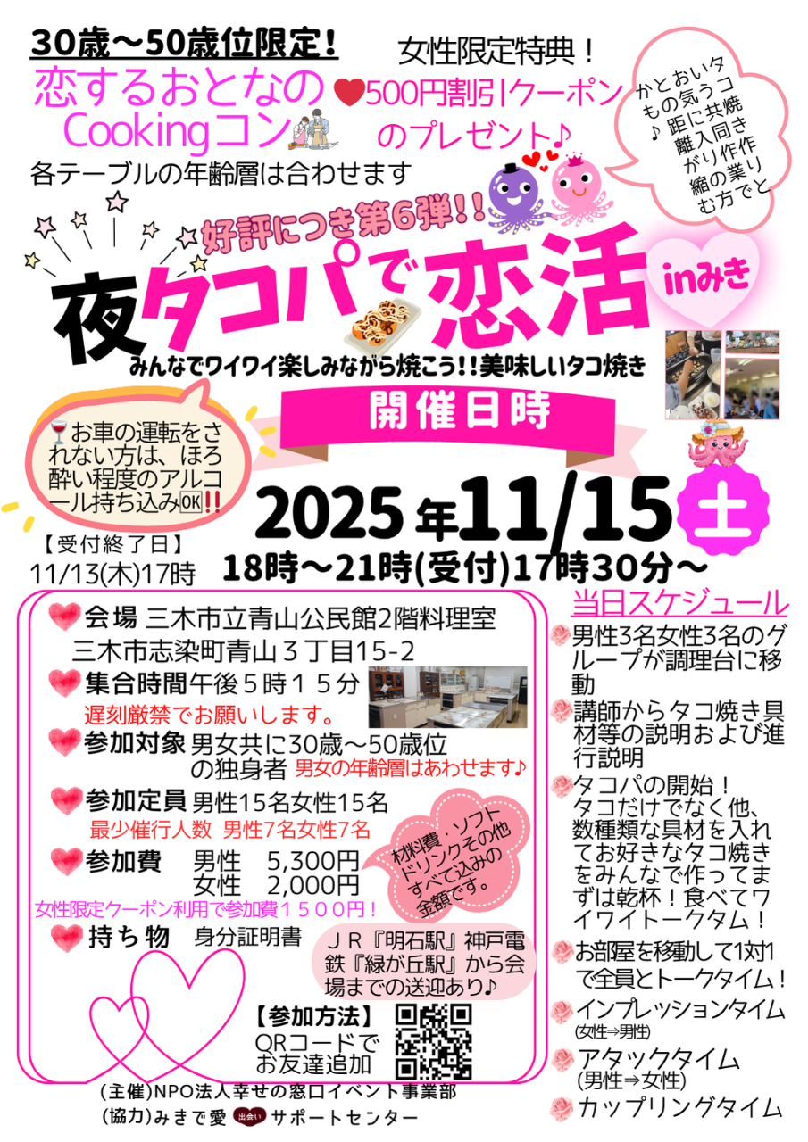 NEW☆彡みきで愛サポートセンター協力イベント☆恋するおとなのCookingコン♡夜タコパで恋活パーティーinみき