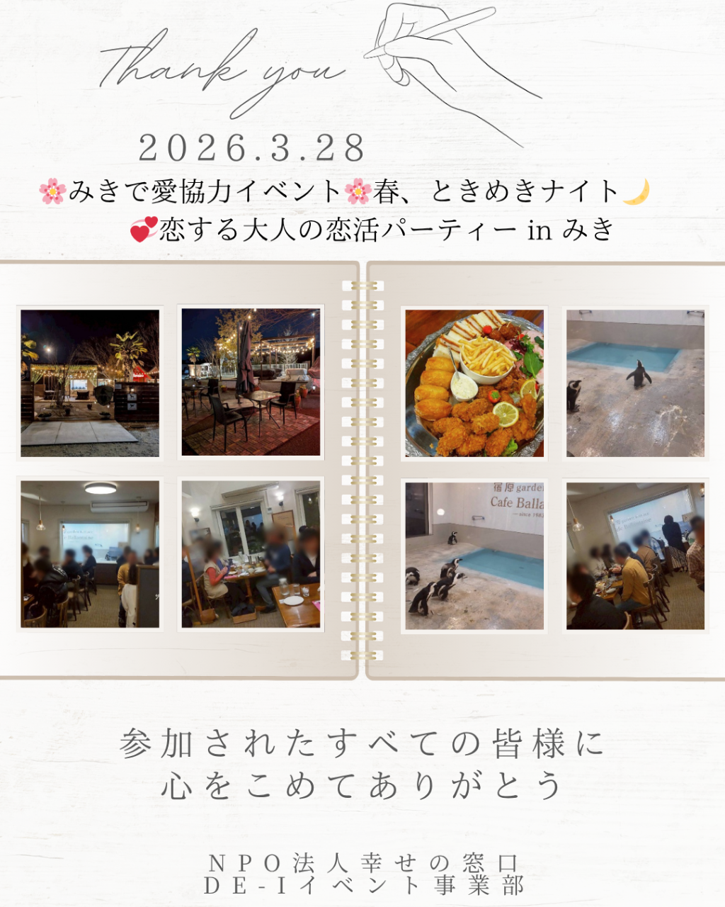 みきで愛協力イベント☆春、ときめきナイト♡恋活パーティーinみき~ペンギンがそっと見守る、大人の恋時間♡~(このイベントは終了しました。)