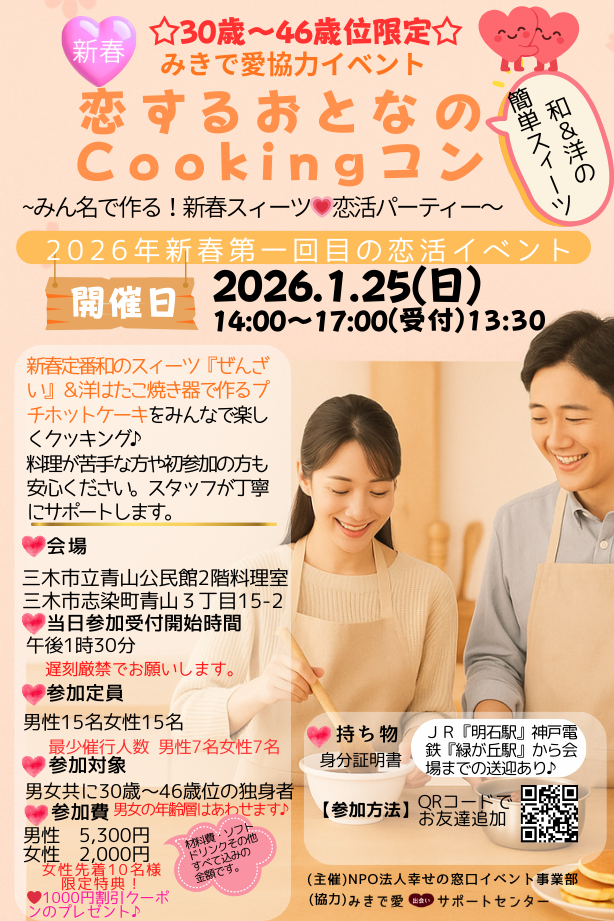 みきで愛 協力イベント 2026年のスタートに、甘いスィーツを囲みながら、 自然に交流できる、 新春第一回目の恋活イベントを開催します✨ 料理が苦手な方も、 恋活イベントが初めての女性も大歓迎!!
