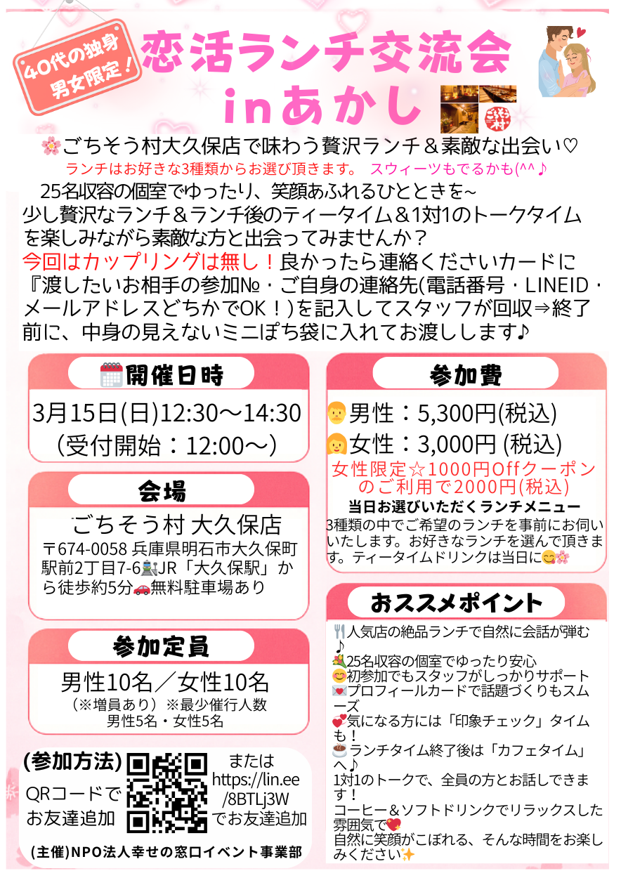 NEW☆彡40代の独身限定♡恋活ランチinあかし~少し贅沢ランチ&素敵な出会い~